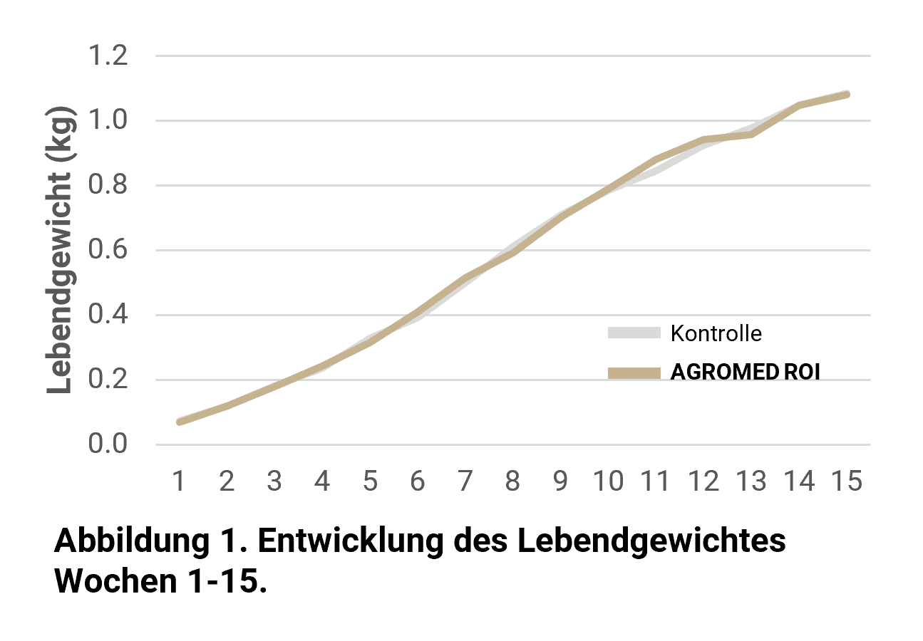 Das Lebendgewicht gilt als einer der sensibelsten Indikatoren für Störungen während der Aufzucht. Typische Krankheitsverläufe führen zu sinkender Futteraufnahme, einer Umverteilung der Energie im Stoffwechsel zugunsten der Immunantwort, was in einem Einbruch in der Lebendmassezunahme oder einer verzögerten Entwicklung resultiert. Die Daten aus der Praxis zeigen: Die Versuchsgruppe entwickelte sich nahezu parallel zur gesunden Kontrollgruppe (Abbildung 1). Es gab keine Anzeichen für anhaltende Wachstumsdepressionen, obwohl Gesundheitsbelastungen vorlagen. Das spricht für einen stabilen Stoffwechsel, der nicht dauerhaft in entzündliche Prozesse abgleiten musste.